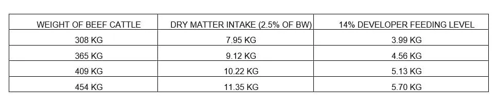 This ration is to be fed to beef cattle at a rate of 4.56 kg to beef cattle weighing 365 kg and consuming 2.5 % of body weight on a dry matter basis. Always have a source of clean water with adequate amounts available at all times. Provide free choice good quality forage. Have free choice salt available at all times. Feeding directions must be carefully followed. Contact a New Rosedale Feedmill representative for more information.