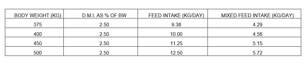 Mix 25 kg of this premix with 5 kg of salt and 970 kg of barley or mixed grain to make one tonne of beef cattle ration. Feed the resulting ration to finishing beef cattle according to the table below: Contact a New Rosedale Feedmill representative for more information.