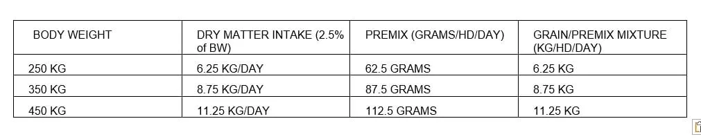 2. The following table shows the amount of grain/premix required per day to different body weights as to provide 33 mg of monensin sodium per kilogram in the total diet dry matter. In some herds, no additional improvement in feed efficiency was shown from feeding monensin at levels greater than 33 mg/kg. Decisions on the appropriate dose of monensin should be made in consultation with your veterinarian.