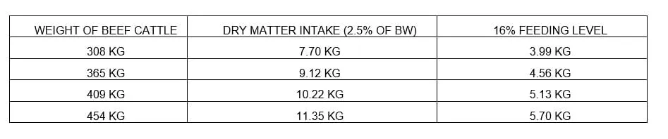 This ration is to be fed to beef cattle at a rate of 4.56 kg to beef cattle weighing 365 kg and consuming 2.5 % of body weight on a dry matter basis. Always have a source of clean water with adequate amounts available at all times. Provide free choice good quality forage. Have free choice salt available at all times. Feeding directions must be carefully followed. Contact a New Rosedale Feedmill representative for more information.