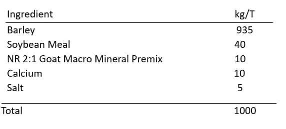 This premix is intended for use with legume type forage feeding programs for goats. Mix this macro premix with grain & protein. Consult your New Rosedale Feedmill advisor for farm specific alternatives. Do not feed this premix undiluted. Mix NR Goat Macro Premix with barley and soybean meal to make a 12% Goat ration.