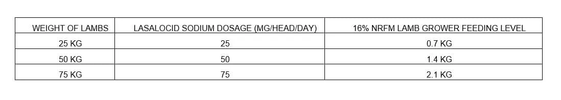 This ration is it be fed at a rate of 0.7 kg to 2.1 kg per head per day for lambs weighing 25 to 75 kg. Be sure to keep feed fresh. Feed continuously during periods of exposure to coccidiosis or when coccidiosis is likely to be a hazard. Contact a New Rosedale Feedmill representative for more information.