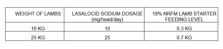 This ration is it be fed at a rate of 0.3 to 0.7 kg per head per day for young lambs weighing 10 to 25 kg. Be sure to keep feed fresh. Feed continuously during periods of exposure to coccidiosis or when coccidiosis is likely to be a hazard. Contact a New Rosedale Feedmill representative for more information.